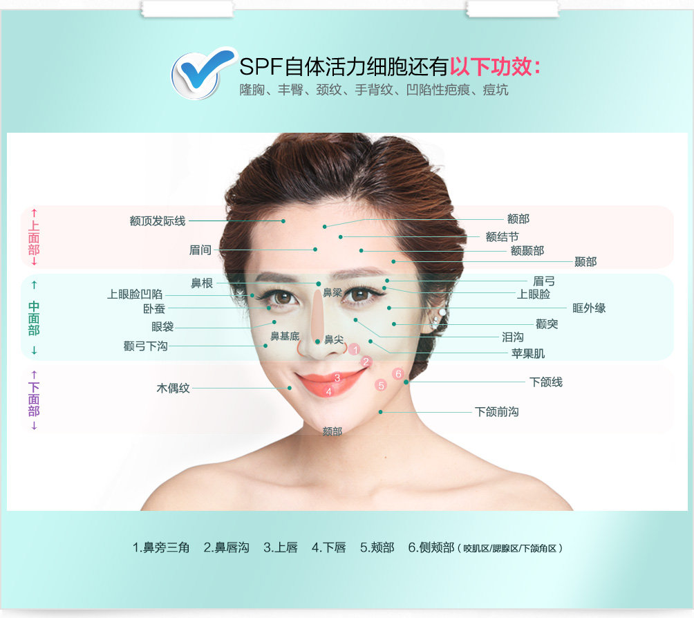 將脂肪顆粒進行活細胞的凈化提煉,篩選、實驗室專用培養(yǎng)液培植并提純SPF活性細胞(脂肪干細胞凝膠)。10ML的脂肪顆粒約提純1ML的SPF精華,搭建活力的微循環(huán)系統(tǒng),啟動自體細胞再生功能,促進了原自體細胞的再生長,啟動自體細胞分化、增殖功能??捎糜诰毑课坏奶畛洌[脹較輕、恢復時間短、細胞存活率較高。